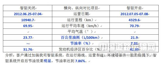 杨军还告诉笔者,后来,大金龙的技术人员还专门为我们进行了为期半个月的对比测试,就是对比同一辆车在开启“智驱”和关闭“智驱”两种状态下的实际油耗。根据这份对比测试报告,“智驱”关闭状态下,平均百公里油耗为23.77升,“智驱”开启状态下,平均百公里油耗为21.9升,节油率达到了7.86%。