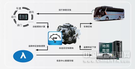 很快,大金龙新技术研究团队想到了电子地图可以提前预知道路的实际环境。而之前,大量经过数理统计和数据挖掘技术得到的档位与路况、转速与负荷、油门与路面等的数学模型,已使客车具备了一定的节油“思维”能力。下一步的核心是,在路况的指令下,如何用互联网技术“智慧”驱动客车。