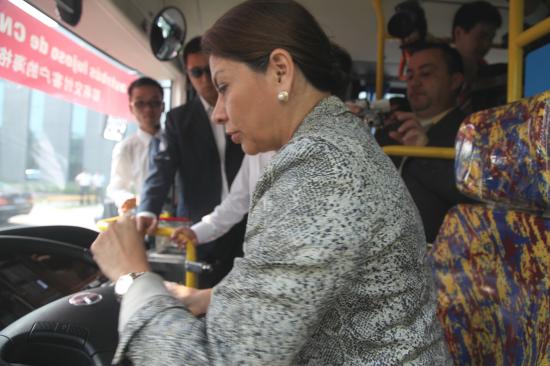 哥斯达黎加总统钦奇利亚登上海格天然气客车参观并体验驾驶区