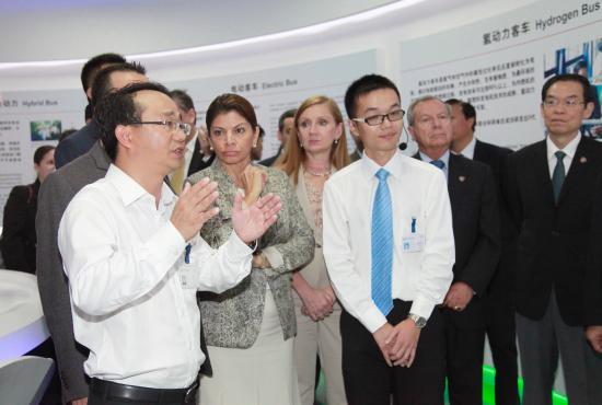 哥斯达黎加总统钦奇利亚听取苏州金龙总经理吴文文介绍海格新能源客车