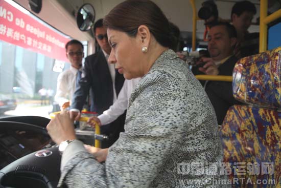 走出展厅,快步登上一辆崭新的公交车,摸摸扶手,坐坐驾驶位,摆弄几下方向盘,还按响喇叭……这是8月14日上午发生在苏州金龙海格客车公司内的一幕。该款公交车不久将批量出口到哥斯达黎加,而来访的该国女总统钦奇利亚则饶有兴致地客串了一把 “验车员”。当天,在苏州访问的短短三个小时里,哥斯达黎加总统钦奇利亚一行专门安排时间来到海格参观访问。