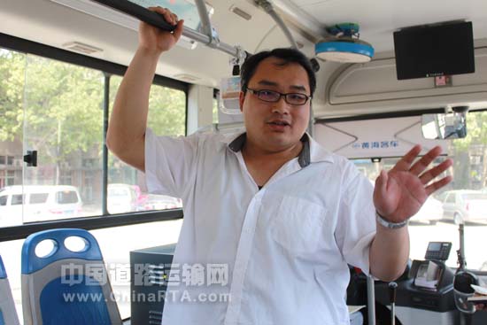 这款车装配的多种高科技装置增加了车辆的安全性,刘金明说:“车辆前后门都有防夹装置,如乘客不小心被车门夹到,门便会自动弹开,保障了乘客的安全。”另外,车上装有多个摄像头,车厢内360度全方位都可以监控到,既保证行车安全又可以避免服务纠纷。刘金明还谈道:“这款车最值得称道的是GPS卫星传控系统,这套系统可以连接路上车辆与站务室,站务室有情况可以随时给正在行驶的车辆发信息,信息能通过驾驶操作台显示,以此通知驾驶员路上及车辆的各种情况,例如两车间距过大或过小时便会提示。同时,驾驶员可以通过系统进行自动短信回传,告知站务室所开车辆的状况,例如车辆加气、故障报修等,我们只要轻轻一按操作按键即可完成,方便且安全。”