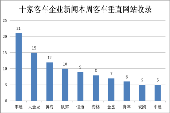 在5家客车垂直网站中,上周10家客车企业共计有98条相关新闻,较前一周的88条有所提升。