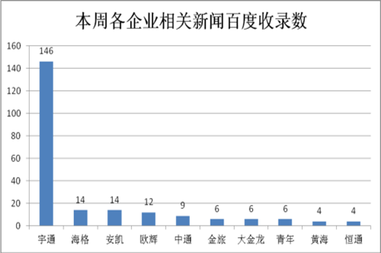 上周百度新闻收录中,宇通转载量最多的三条新闻为:《卧铺大巴被指早已被禁售 宇通等客车商仍暗售 》(80次);《宇通投放国内首款B照校车 依照新国标》(26次);《宇通一家独大 上周客车新闻舆情明升暗降 》(10次)。
