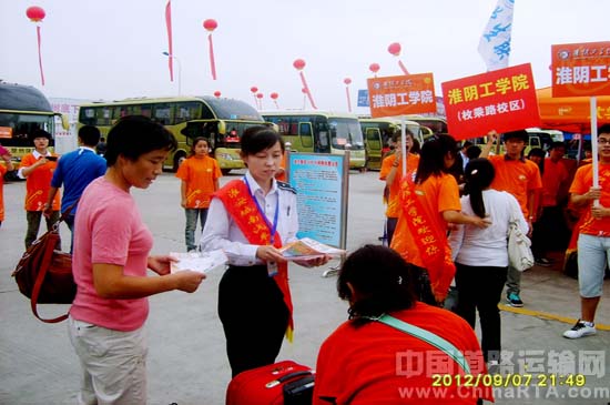 2012年9月8日上午,淮汽集团各客运站点迎来学子入学报到客运高峰,淮汽集团城南客运站工会组织志愿者在提供优质服务的同时免费向大学生发放展示企业品牌的宣传资料1500余份;淮汽快客司机不辞劳苦的主动帮助大学生搬运行李,得到了广大师生的一致好评。