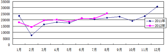 2012年8月,中国客车统计信息网50家企业共销售各类客车25249辆,同比增长16.37%,形成了今年以来十分显著的销量高峰。1-8月,50家企业累计销售客车158163辆,同比增长7.91%,其中,大型客车销量53043辆,增长10.90%,中型客车销量51498辆,增长8.90%,轻型客车销量53622辆,同比增长4.22%。如图所示,8月份的客车销量,一举突破了连续5个月的低迷走势,显得激进而突然,从数据的表现来看,两大因素影响最大。