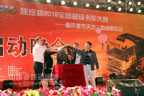 随后,中共奉节县委常委宣传部部长 吴宗华,全国超级卡车大赛组委会秘书长 刘小勇,奉节县人大常委会副主任 张述林,奉节县政协副主席 何永芬,陕西重汽销售公司重庆办事处服务总经理 付新波,一起启动了触摸球。代表着“陕汽杯”2012全国超级卡车大赛奉节天坑•地缝景区站分站赛正式开始。
