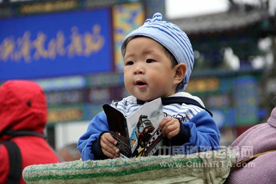 嘉年华上站在妈妈背篓里的孩子