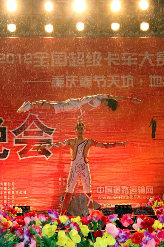 最后,美仑美奂的舞蹈《飞天》为晚会拉下了帷幕,而“陕汽杯2012全国超级卡车越野大赛重庆奉节天坑•地缝景区站”却才刚刚开始。9月27日下午将在天坑•地缝赛车场举行卡车越野赛预赛,9月28日下午举行本站半决赛及决赛,届时CCTV-5将在14:30-16:00期间现场直播。全国50余名赛车手即将巅峰对决,奉节天坑•地缝赛车场将会上演怎样的争夺战,?“陕汽杯2012全国超级卡车越野大赛重庆奉节天坑•地缝景区分站赛”邀您,不见不散!