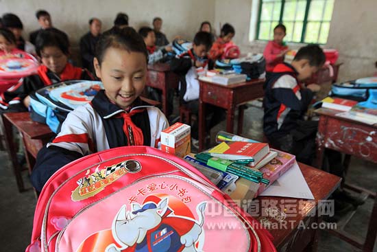 随后,伴着孩子们的欢呼,工作人员把“卡卡爱心小书包”分别送给了孩子们,并承诺每年都会支付每个孩子800元的学费,直到他们小学毕业。孩子们从书包里拿出各种各样的学习用品,满脸的惊喜和开心。破烂不堪的桌椅映衬着这些纯真的脸庞,在场的每个人都悄悄地红了眼眶。