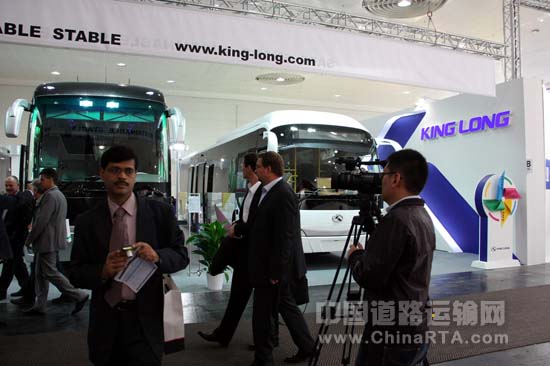 大金龙在IAA车展上受到越来越多的关注,图为中央电视台记者正在拍摄采访