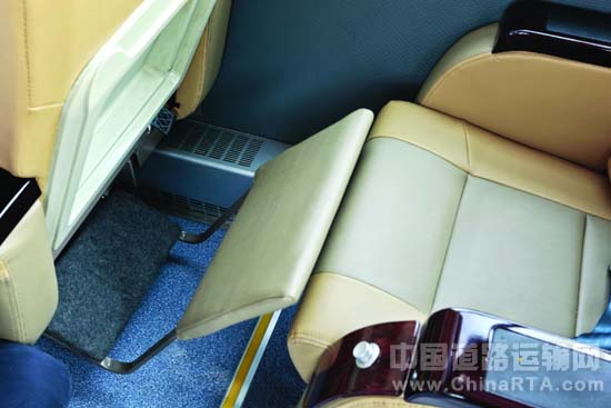对于代卧车,重点是不是卧铺车但又却有卧铺的舒适度,海格的工程师们对车内的座椅和座椅布置进行了一番琢磨之后,采用了大倾角靠背的豪华航空座椅,并在每一座位的前方安装了可以搁脚和腿的脚托腿托。当座椅后背完全放倒时,腿脚搁在前方的搁板上,几乎起到了同卧铺车相同的舒适度,至少在单程的近200公里内记者的感觉非常舒服。而腿托和脚托在座椅直立时,可以自动收起,设计十分巧妙。