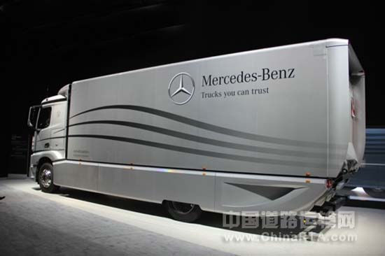 奔驰在本次车展上首发了全新设计的Antos中重卡,希望以这款新车逐步替代之前的Axor车型。Actros旗舰型重卡外形也大变样,更加富有肌肉感和动感。奔驰把换代驾驶室+一体化货箱的这种组合称为“Aerodynamik”,笔者理解为“空气动力型卡车”;