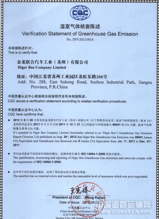 2009年海格客车就率先在客车行业通过了ISO14001:2004环境管理体系认证,此次又成为首家通过ISO14064-1标准核查的客车企业,充分体现了海格客车对环境管理的重视。通过此次对GHG的盘查,海格确定了基准年的碳排放量,这也将为之后应对政府推行的“碳税制度”的实施做好基础准备。