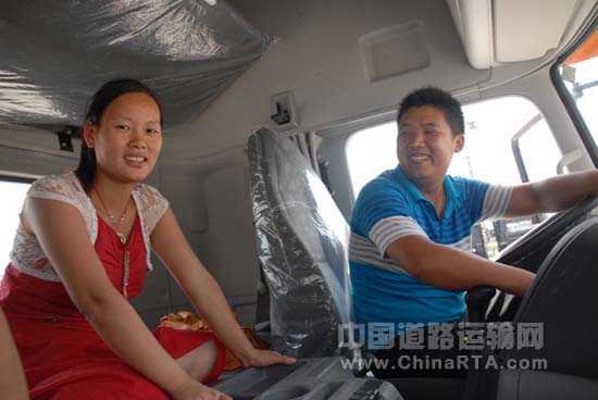 李靖夫妻坐上新买的东风天龙时露出了幸福的微笑