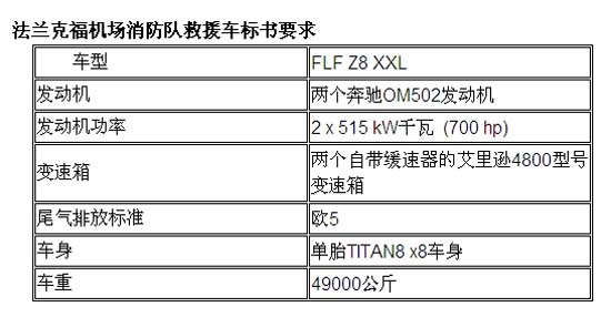 10月份,德国法兰克福机场开通了第四条位于西北角的飞机跑道,从而令这一德国最大的机场的跑道区扩大为220公亩。为了增加紧急基础设施,法兰克福机场还新建了一座消防站,并壮大了机场消防车队。该机场从Albert Ziegler GmbH & Co. KG公司采购了六辆FLF Z8 XXL型号的救援车,其中两辆已经到位。这两辆救援车,分别配有两台奔驰OM 502 (欧 5) V8柴油发动机,功率高达1030千瓦(1400马力);而且分别在车上装置了两台自带缓速器的艾里逊4800型号七档全自动变速箱,使得自重49吨的车辆可以在21秒内,车速从0提到80公里/小时,最高时速可达135千米/小时。目前这两辆救援车已在飞机跑道随时待命救急,并处理一些机场外围的紧急事务。