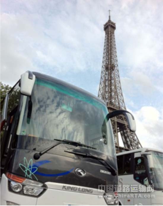随着品质不断提升,大金龙加速进军欧盟的步伐,图为在艾菲尔铁塔下的金龙客车