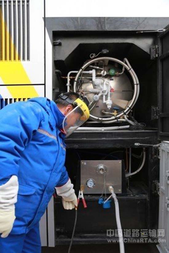 配图:加气站工作人员正在为福田欧辉双层LNG公交加气