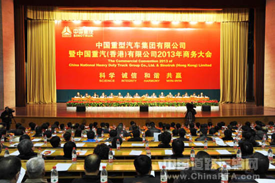 12月15日,中国重型汽车集团有限公司暨中国重汽(香港)有限公司2013年商务大会在济南隆重召开,会议强调,要继续大力实施产品结构调整优化,全面推进品系营销工作,提升渠道运营能力,打造全面支撑中国重汽品牌形象和市场销售的服务网路,把中国重汽建设成为世界级的商用汽车集团,继续做中国重卡行业的领跑者,为振兴民族汽车工业,引领中国商用车产业进入崭新的时代,引领中国重卡进入世界先进水平,实现中华民族的伟大复兴而努力奋斗。