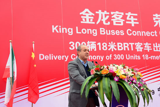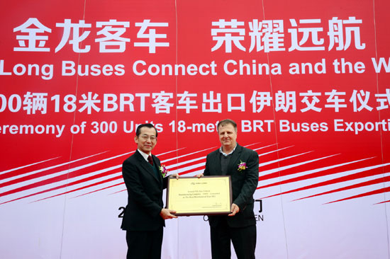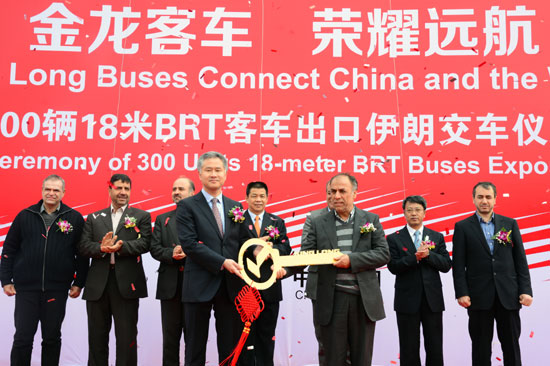 300辆大金龙18米BRT客车出口伊朗,不仅是国内最大批次的BRT客车出口订单,也是近年来厦门市工业产品出口金额最大的订单,以厦门市副市长李栋梁为代表的当地政府和十多个主管部门领导出席交车仪式;伊朗方面也十分重视此次订单交付,德黑兰市副市长Hossein Mohammadpour Zarandi先生率领14人代表团亲临厦门,迎接300辆18米BRT客车回国。