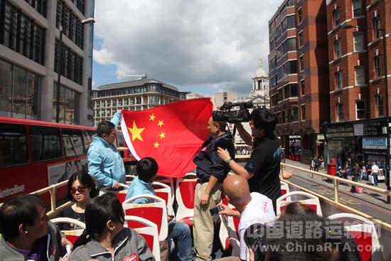 中国游客们在安凯双层车上扬起国旗为奥运健儿助威