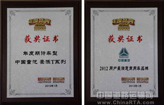 2013年1月11日,由《商用车界》杂志主办,交通运输部公路科学研究院、中国汽车技术中心、北京理工大学、长安大学、北京航空航天大学、内蒙古工业大学等单位协办的“2012商用车界年度盛典”在北京隆重举行。中国重汽HOWO T系列重卡获年度期待车型称号。中国重汽同时还被评为“2012用户最满意商用车品牌”。
