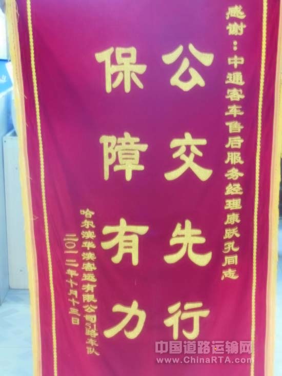 2012年10月18日,哈尔滨市华滨客运公司将一面写有“保障有力 公交先行”的锦旗和一封感谢信寄给了中通客车技术服务部东北地区服务人员康跃孔,对他的现场服务工作给予了高度的赞扬和衷心的感谢……