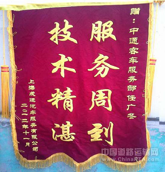 近日,上海成运汽车服务有限公司将一面“服务周到 技术精湛”的锦旗寄至中通客车技术服务部,对上海服务人员任广冬同志的服务工作给予了高度评价和真诚的感谢…..