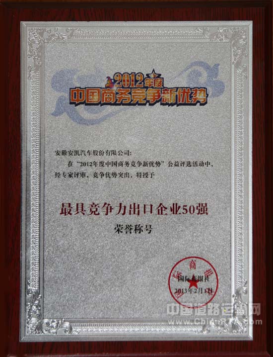 2013年2月1日,在商务部国际商报社主办的“2012年度中国商务杰出企业及风云人物评选”活动中,凭借着近几年在海外市场的优异表现,安凯客车成功入选“最具竞争力出口企业50强”,成为 2012年全面打造“竞争新优势”的中国出口企业代表。