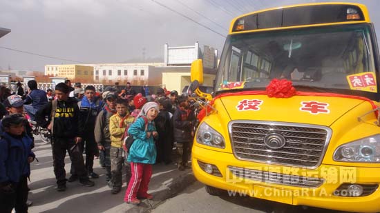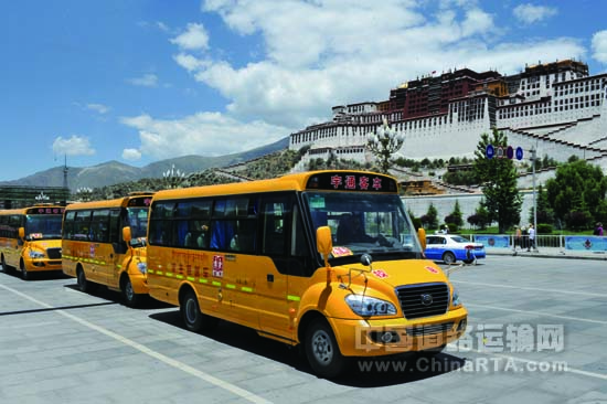 2011年6月29日,53辆长鼻子校车驶上了雪域高原抵达西藏拉萨。这批宇通专用校车由拉萨市政府全资投入1372.7万元购买,用于接送所属七县一区所有农牧区中小学生上下学,为青藏高原学童的平安出行保驾护航。