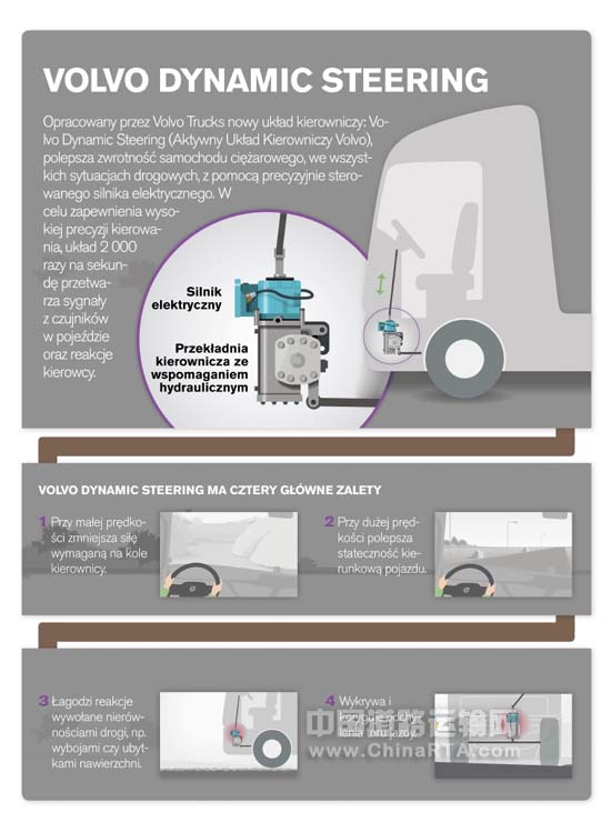 沃尔沃卡车继去年九月发布了震撼全球的全新FH系列车型,如今又将推出世界级的创新技术应用——沃尔沃动态转向系统(Volvo Dynamic Steering)。创新系统是在传统的液压转向器的基础上,新增电机,实现更精确的转向响应,为卡车司机提供更舒适更自如的驾驶体验。