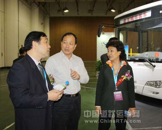 金龙汽车集团副总经理许振明向福建省经济贸易委员会副主任郑李亭(左)、福建省企业家联合会会长贺汪洋介绍企业发展情况