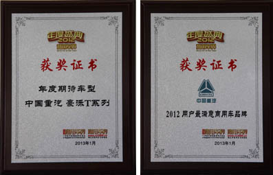 2013年1月11日,由《商用车界》杂志主办,交通运输部公路科学研究院、中国汽车技术中心、北京理工大学、长安大学、北京航空航天大学、内蒙古工业大学等单位协办的“2012商用车界年度盛典”在北京隆重举行。中国重汽HOWO T系列重卡获年度期待车型称号。中国重汽同时还被评为“2012用户最满意商用车品牌”。