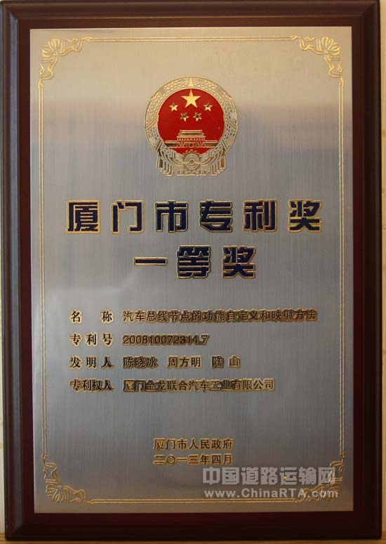 4月18日下午,在厦门市知识产权工作会议上,首届厦门市专利奖评选结果正式公布,厦门市专利奖励委员会通过专家初评、终评和结果公示,最终评选出2012年厦门市专利奖一等奖项目3项、二等奖项目8项、三等奖项目29项。其中,大金龙申报的发明专利《汽车总线节点的功能自定义和映射方法》被评为一等奖的第一名,获得10万元奖励。