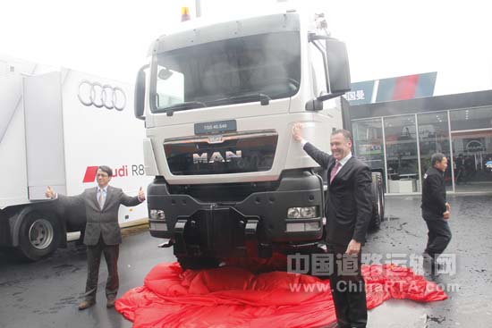 外观引人瞩目的TGS 18.400 4×2 BLS 牵引车是德国曼和奥迪强强联合打造的产品。作为奥迪R8运输车,其外廓尺寸达5875×2500×3359毫米,轴距3600毫米,后悬800毫米,整车倍显大气。该车连同挂车在内,长度超过17米,目前来看是全展会最长的车型。在负载能力方面,整车准牵引质量35995千克。与超强承载能力相得益彰的,是6875千克的超低自重和119.5公里的最高时速,这些配置在节省了可观燃油支出的同时获得了更高的运输效率。作为一款高效运输车,它拥有出色的稳定性、优秀的驾乘舒适性和卓越的操控性。该产品采用LX型驾驶室,配有多功能方向盘,高度、角度可调,让驾驶轻松自如;此外,该车配置双层舒适卧铺、高舒适性气垫座椅、副驾驶员座椅前后位置与靠背倾斜度可调,采用机械式遮阳卷帘、自动温度控制的空调系统、可加热电动调节后视镜,并带有天窗。驾驶室设计围绕营造便捷操控、集中驾驶与安逸休息的场所而展开。德国曼深知,驾驶员只有在良好的状态下才能有精彩的表现,进而成就安全、高效的运输。在动力方面,TGS 18.400 4×2 BLS 牵引车搭载排量达10.518升的MAN D2066LF41的6 缸带涡轮增压中冷电控柴油共轨发动机,功率高达400马力/294千瓦,最大扭矩1900牛米,超强动力让该产品一路所向披靡。在打造高效运输产品的同时,德国曼也十分重视车辆的环保性,通过采用SCR后处理系统,TGS 18.400 4×2 BLS 牵引车达到欧Ⅴ排放标准,可为环保做出巨大贡献。