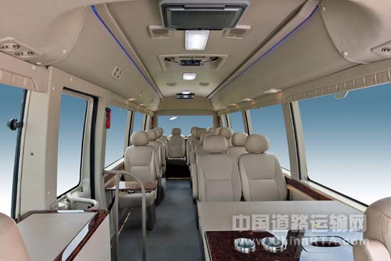开启车门,首先映入眼帘的就是门边的可折叠电脑桌和一张宽大的多功能商务办公桌,办公桌上电热水壶底座、餐巾抽纸盒、毛巾架以及三相电源插座等一应俱全,车载办公条件便利;豪华商务座椅则可大大缓解旅途劳顿;空气净化系统令车内空气清新宜人;独特的深色印刷侧窗使乘车人在尽览沿途风光的同时也获得了良好的私密性。