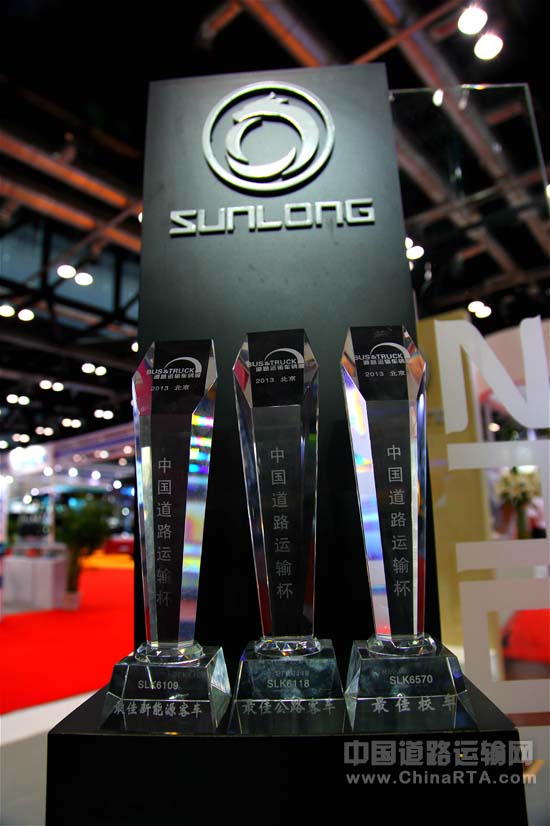 中国道路运输杯颁奖盛典在国家会议中心隆重举行。申龙客车四款新品中的SLK6118大型豪华客车、SLK6109纯电动城市公交以及SLK6570长头校车分别荣获“2013最佳公路客车奖”、“2013最佳新能源客车奖”以及“2013最佳校车奖”三项大奖。