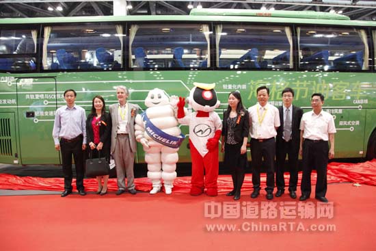 5月22日,北京国际道路运输、城市公交车辆及零部件展览会隆重开幕。海格客车联合米其林轮胎联合发布客车行业首款智慧节油客车。经测定,在满载工况下,此款海格12米大巴的百公里油耗仅为19.97升。交通运输部科学研究院党委书记王晓曼、中国道路运输协会常务副会长孔卫国、海格客车客户服务总监谢江宏、米其林产品技术总监Michael和米其林原配销售总监李凌为海格智慧节油客车发布揭幕。