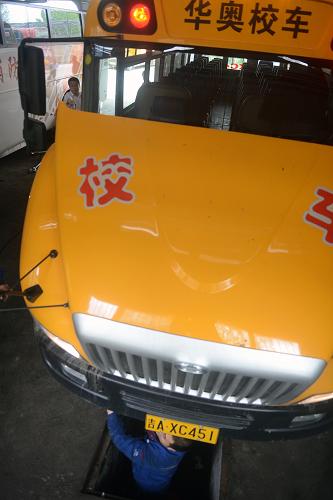 5月28日,吉林省校车服务中心工作人员在检查一辆校车的压缩机皮带松紧度。吉林省校车服务中心于今年1月成立,依托宇通客车在长春市和省内19家维修服务网点,解决了以往市、县(区)校车服务资源独立运行的问题,使全省校车安全运营体系更加完善。成立至今的四个月时间里,已为吉林省近800辆校车提供安全检查和维修服务。同时,中心通过电子信息监控平台,对吉林省7200余辆各品牌校车车辆运营情况进行监控,确保校车的规范运营。此外,中心还利用每年寒暑假时间免费为全省校车提供两次检测,并对全省校车驾驶员提供专业的安全驾驶培训,为学生的安全出行保驾护航。