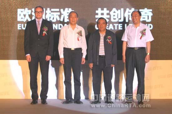福田戴姆勒总裁吴越俊(右一)、执行副总裁史蒂芬(左一)共同发布欧曼GTL新品