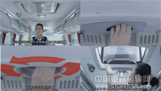 客车所配备的顶部撤离舱口也具有安全出口功能。打开把手罩,按图示上的箭头方向旋转,向上推出,舱盖即可翻转打开。在危机关头,可为少数乘客尤其身材较小的乘客多提供一种逃生方法。如果车辆发生侧翻,正好把门堵住,就要启用车顶的紧急出口。