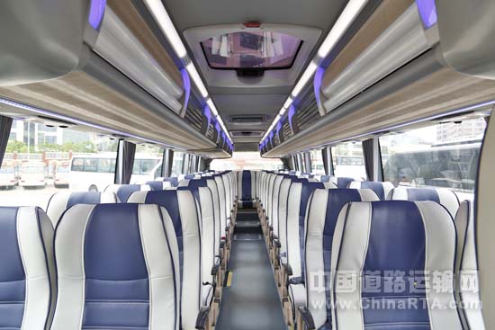 沿楼梯进入乘客区,一层半客车的第一排座椅位于驾驶员头顶,视野非常开阔,但这开阔的视野也会让乘客在进入高速公路时产生恐惧感。XML6102J在设计时显然想到了这个问题,它将正前方的玻璃面积缩小,同时将骨架包围在这个位置做的很宽大,挡住一部分视线。使得坐在这个位置的乘客既有较好的视野,同时还有可依靠的安全感。