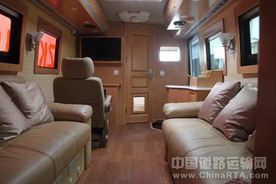 首次参展的ZK5180XZS1商务车采用宇通自制底盘,车长12米,宽2.55米,高3.9米,整车造型圆润大气,极富美感。宇通整车阴极电泳技术的使用,为车身的持久亮丽如新提供了强有力的保障。该车车侧装备2台55寸三星液晶电视机,可以向观众清晰传达视频信息。车内布置豪华,舒适的沙发椅、55寸超大液晶电视、办公桌、绚丽的星光顶等,车内乘坐的舒适性大大加强,极尽奢华享受。