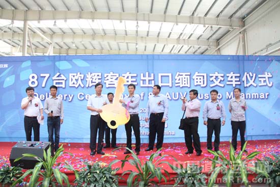 7月13日,在福田欧辉客车广东工厂举办了87台欧辉客车出口缅甸交车仪式。福田汽车集团副总裁、欧辉客车事业部总经理解佃峰将一把象征着出口缅甸奥肯博公司的欧辉客车模型钥匙交到了奥肯博公司董事长姜建华的手中,标志着“福田欧辉客车出口缅甸奥肯博公司大客车交车仪式”取得圆满成功。