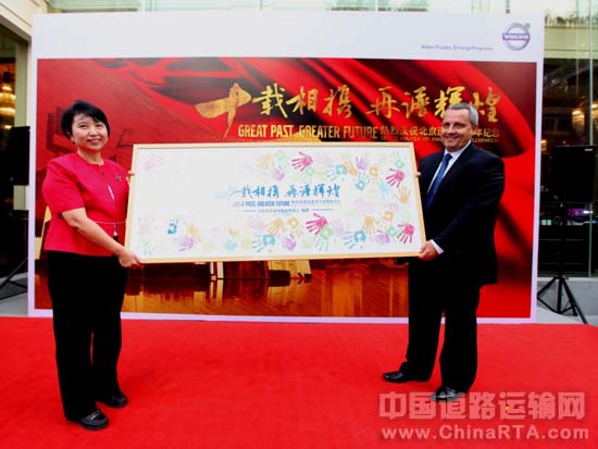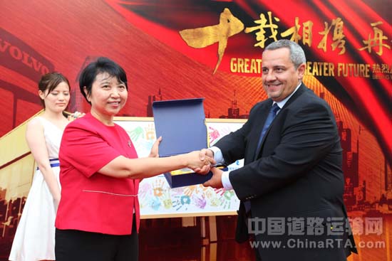 沃尔沃卡车中国区总裁陆博天(右)为北京沃卡董事长王新兰女士(左)颁发纪念奖品庆祝北京沃卡十年辉煌