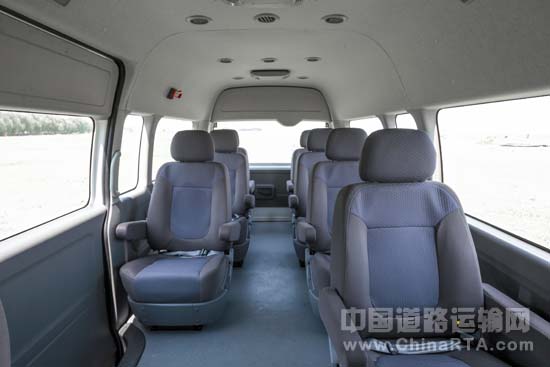 该车共9座,乘客座椅的前后间距较大,将近80cm,且靠背可以前后移动。整车的座椅布置充分利用了车内有效空间,并且座椅外形融入人机工程学原理。座椅设计不仅有充分的理论、数据依据,还进行了大量的试验,从而找到最适合驾驶、保证安全而又舒适的坐姿,即便长时间乘坐也不易疲劳,车内所有座椅构造均符合人体曲线,乘坐舒适,令旅途行车倍感愉悦。座椅上方巨大的行李架还可存放大件行李。在正对车门处设有一张桌子,有4个座位可以倚桌而坐,桌边的人可以读书学习、上网、给手机充电,还可以围坐聊天、打牌,为整车营造了良好的商旅氛围。车顶镶有吊顶,给整车增添了一丝奢华。轿车化的中控台和丰富实用的配置体现了人性化设计理念。记者乘坐该车时感觉很舒适,行车过程中也感觉不到抖动。
