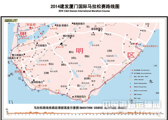 厦门国际马拉松从金门岛隔海相望的厦门国际会议展览中心出发,赛道既有依山傍海、风景如画的环岛路,更有厦门二十名景中的八大景点缀其间,可尽览厦门的天风海韵,因此被誉为“世界上最美的马拉松赛道”,也是国内唯一采用直升机进行全程航拍直播的马拉松赛事。
