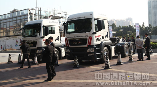 此次研讨会期间,德国曼还展示了其在中国销售的两款主流牵引车,MAN TGS 28.440 6×2-2和MAN TGS 19.400 4×2,这两款车型拥有良好的操控性、出色的可靠性和超低的燃油消耗。其中MAN TGS 28.440 6×2-2配备MAN D2066 LF62 6缸直列涡轮增压中冷电控柴油共轨发动机,排量10.518L,最大功率440马力,最大扭矩2100Nm/1000-1400r/min,发动机动力强劲,节能环保。该车辆配备ZF 16 S 222 DD手动换挡变速箱,16个前进挡,2个倒挡,换挡过程顺畅、精确、毫无顿挫感。MAN TGS 19.400 4×2匹配400马力的发动机并拥有超低的油耗,以及出色的稳定性,优秀的驾乘舒适性和卓越的操控性。