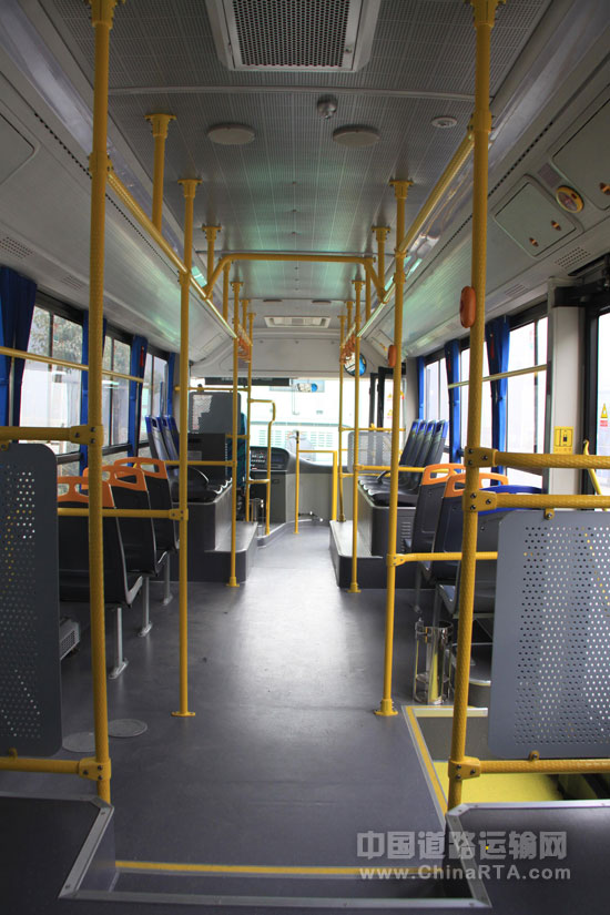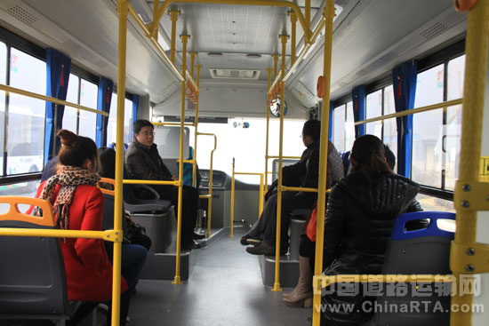 走进新能源公交的车厢内部,坐在舒适的座椅上,笔者感觉车内空间似乎比此前乘坐过的传统公交宽敞不少。在色彩搭配上,柠檬黄的拉杆扶手,给人视觉上一种鲜亮、明快的色彩冲击,整个车厢内视线良好、视野开阔。
