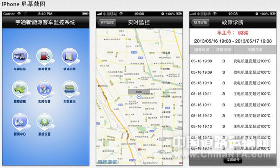 移动互联网的迅猛发展已经成为当前时代发展的重要标志之一,它的方便快捷已经被众多行业所青睐。2013年7月16日,宇通客车为用户倾力打造的智能远程管理移动应用“宇通新能源”率先登陆Apple Store和Android平台。宇通新能源移动应用作为宇通新能源客车的标准配置,不仅支持所有宇通新能源客车产品的管理,而且具备车辆总览、能耗管理、轨迹回放、故障诊断和实时告警等车辆管理功能,方便车企管理人员全方位、随时随地、方便快捷地对车辆进行管理,提高车辆的节能减排效率。
